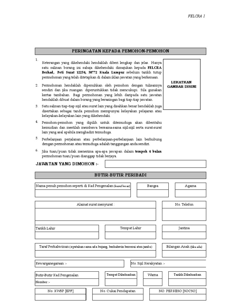 Borang jawatan felcra. Dengan itu kemungkinan saya dapat keluar dari kawasan pada 31 8 2020. Untuk memohon pastikan anda rujuk syarat pengambilan bidang tugas jawatan dan lokasi kekosongan jawatan terlebih dahulu. Saman pdrm hubungi kami.