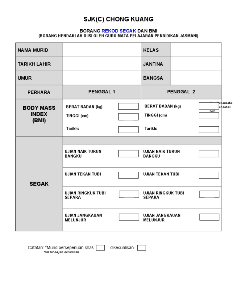 Borang ujian segak 2020. Ujian segak hanya dilaksanakan kepada murid tingkatan lima berumur 17 tahun bagi tahun 2020. Makiumat terperinci berkaitan pelaksanaan ujian segak bagi murid tingkatan lima adalah seperti dalam lampiran a. Metronome 50 detik terkini manual segak sistem segak update 04 04 2011 johor sistem segak versi 3 johor dan melaka sahaja 2014 update 2014 borang rekod segak dan bmi.